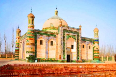 香妃墓坐落在喀什市东郊5千米的浩罕村,系自治区的重点文物保护单位。这是一座典型的伊斯兰古建筑群,也是伊斯兰教圣裔的陵墓,占地2公顷。据说墓内葬有同一家族的五代72人(实际只见大小58个墓穴)。第一代是伊斯兰着名传教士玉素甫霍加。他死后,其长子阿帕克霍加继承了父亲的传教事业,成了明末清初喀什伊斯兰教"