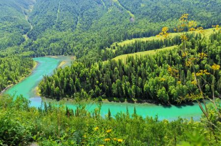 喀纳斯湖月亮湾位于卧龙湾上游约1公里,是卧龙湾河曲的延伸部分,美丽静谧的月亮湾会随喀纳斯湖水变化而变化,确实是嵌在喀纳斯河上的一颗明珠。喀纳斯河床在这里形成几个由反“S”状弯河曲组成的半月牙河湾,被称之为“月亮湾”。